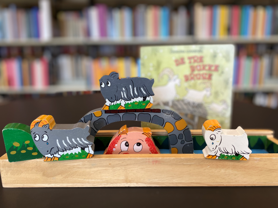Vi fortæller historien om De tre bukkebruse ved hjælp af små figurer. Børnene bidrager til fortællingen ved at lave lyde og bevægelser, der passer til handlingen. Måske finder vi også på vores egen variant af det klassiske eventyr. Bagefter kan børnene tegne sit eget ”monster under broen” eller bare lege og kigge i bøger.
