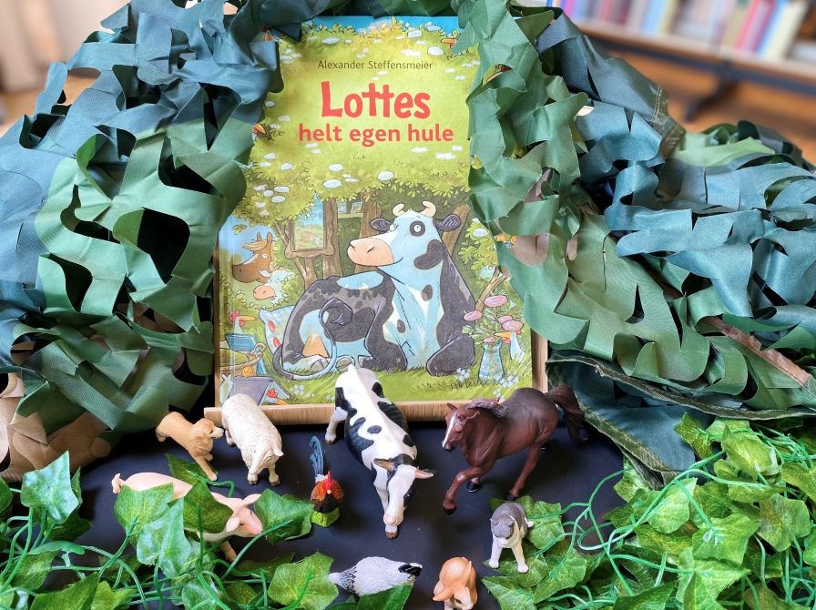 Vi læser billedbogen Lottes helt egen hule og går på jagt efter bondegårdsdyr i børnebiblioteket.