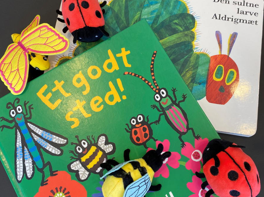 Vi læser klassikeren Den sultne larve Aldrigmæt og billedbogen Et godt sted, der handler om fire insektvenner, der forsøger at finde et godt levested. Børnene er med til at dramatisere fortællingerne med hånddukker. Bagefter kan man klæde sig ud som krible krable-dyr, kigge/læse i bøger, tegne sommerfugle og lege.